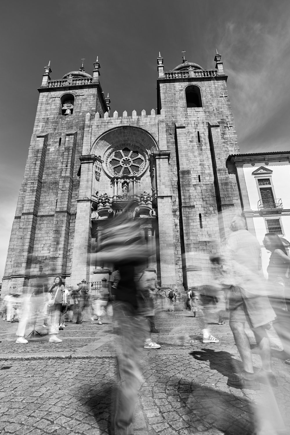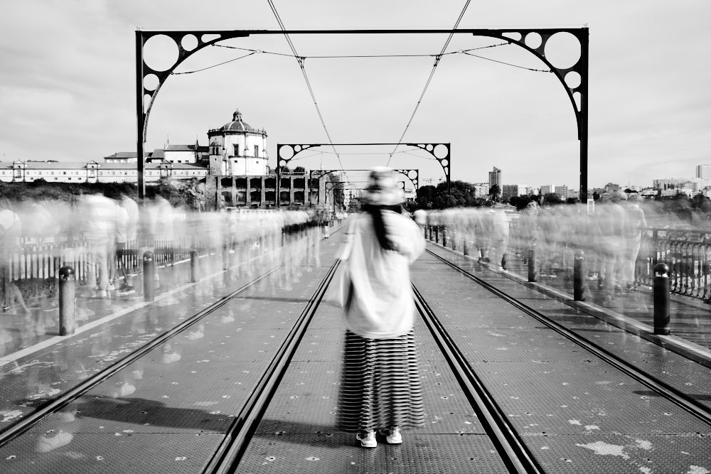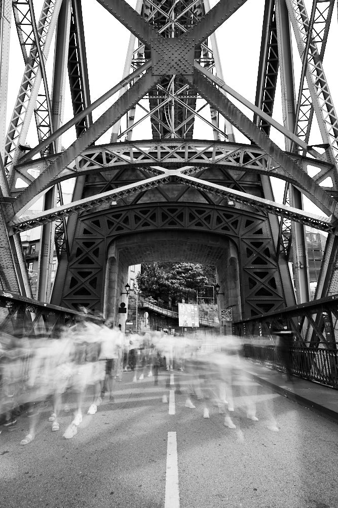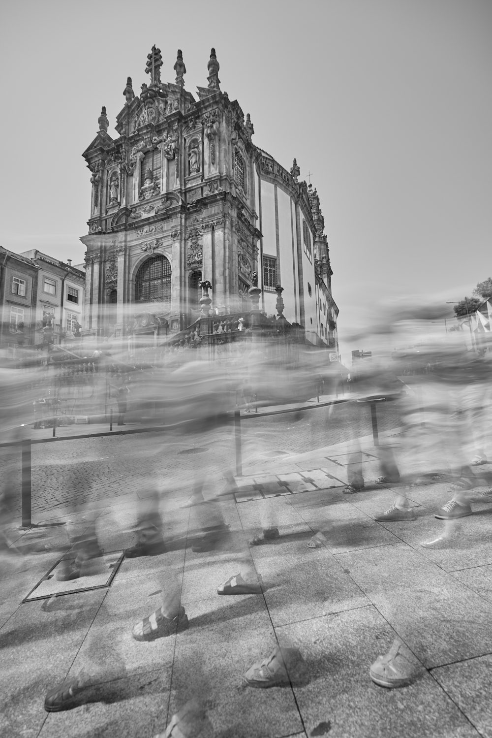 Stripped of identity and possessions, they become silhouettes of time — ghostlike figures gliding through space. Their movements are temporary, yet their presence lingers, etched in light and shadow. Against them stand the buildings, the walls, the streets — solid, unmoving witnesses to countless such moments. Each image is unique.